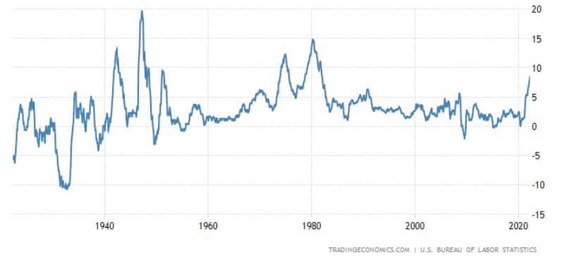 Well, Warren and Charlie have been investing for Berkshire Hathaway since 1962 so they have certainly invested during periods of high inflation. In fact, if you look at the historical chart of inflation below, you might notice an interesting pattern – when Warren and Charlie started investing for Berkshire Hathaway in the early 60s, inflation was very, very low. And then a decade later, inflation started drifting consistently upwards.