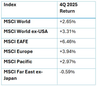 Non-U.S. equities outperformed U.S. markets during the quarter, even as the U.S. dollar strengthened modestly. Developed international and emerging markets both finished the year with strong double-digit returns, benefiting from improving growth expectations and easing financial conditions.